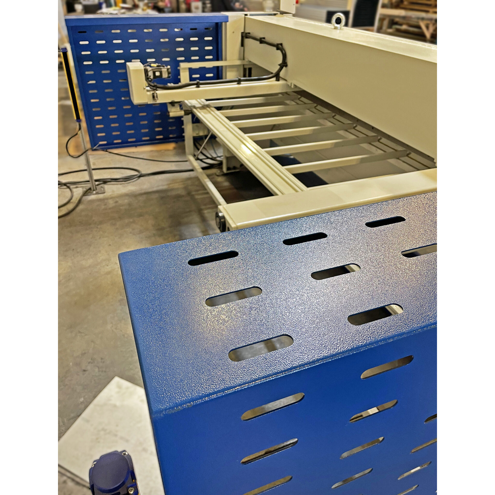 - Fixed Side Squaring Gauge and Stainless Feeding Table with Rulers on Each 500 mm (19.69″) Length